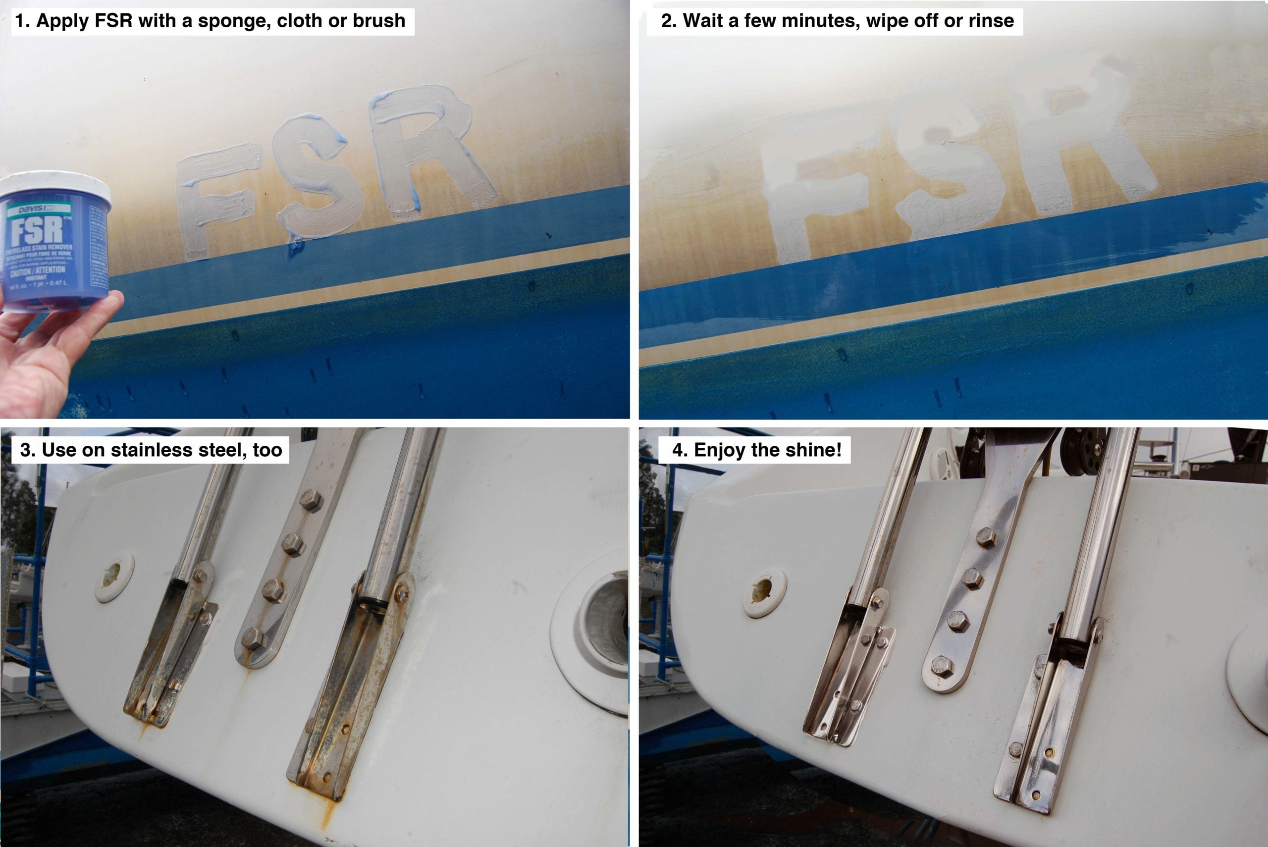 - FSR (Fiberglass Stain Remover) is a unique stain absorbing gel that is ideal for removing oil, rust, exhaust, waterline and transom stains. Works like magic to clean up fiberglass stains!